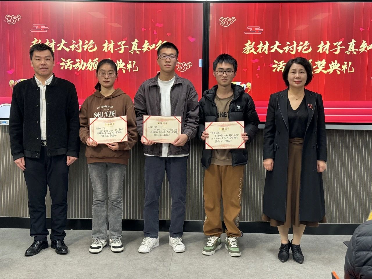 最后,主持人对整个颁奖仪式进行了总结,再次感谢了所有参与活动的同学和老师,并鼓励大家继续努力学习,提高教材的质量。由颁奖嘉宾为获奖同学颁发了一、二、三等奖的奖状,并对他们表示了祝贺。在颁奖仪式结束后,获奖同学和领导老师还进行了合影留念,留下了美好的回忆。在热烈的掌声中,活动圆满结束。