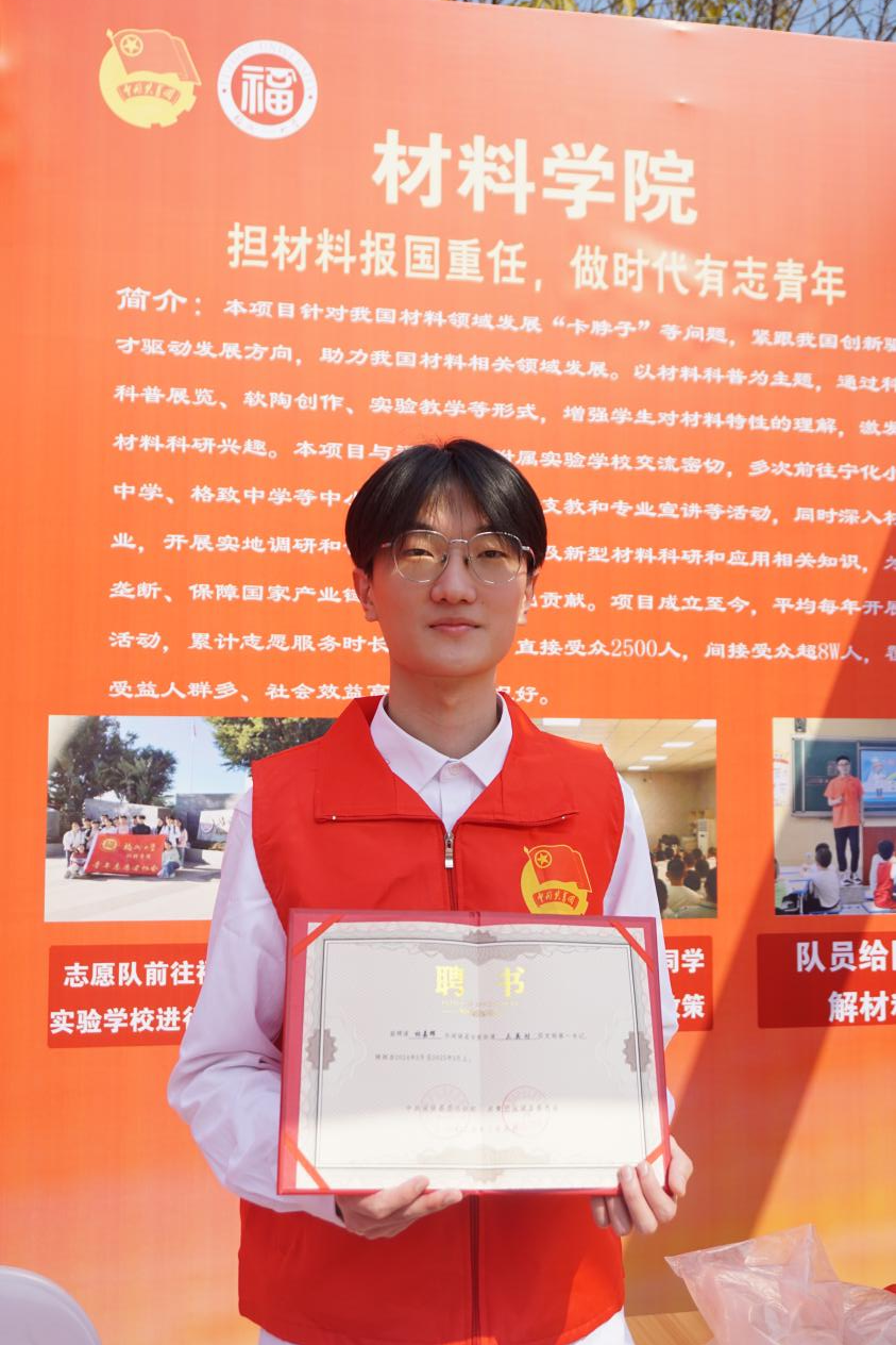 在此次活动中,成人网站 林嘉辉同学被聘任为结对村(社区)团支部第一书记,负责材料学院与社区结对的工作,闽侯团县委、甘蔗街道负责同志为其颁发团干聘书。