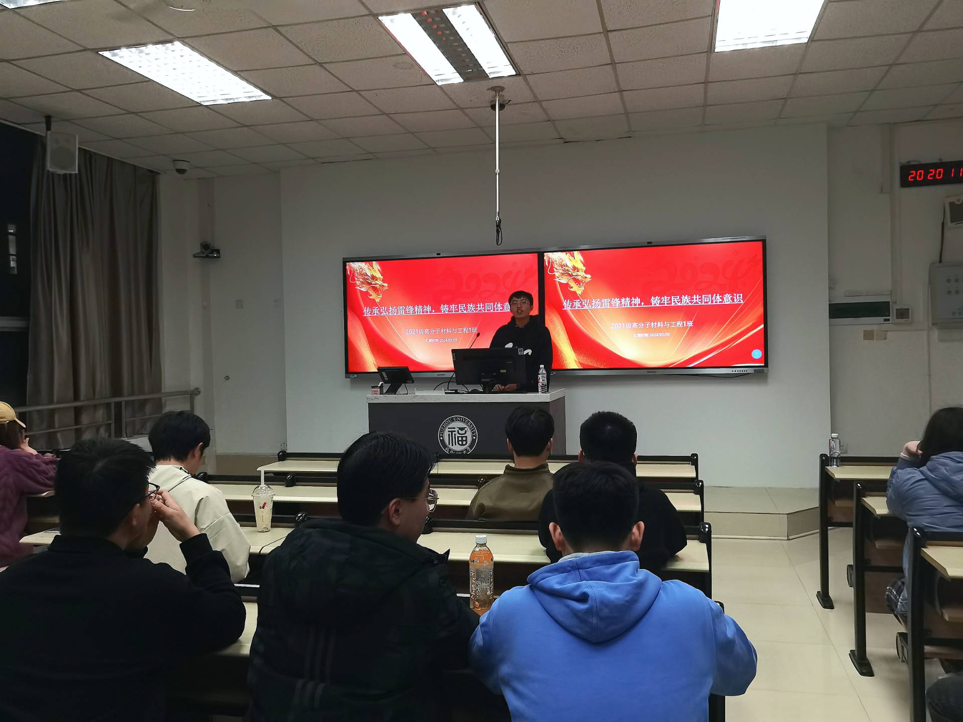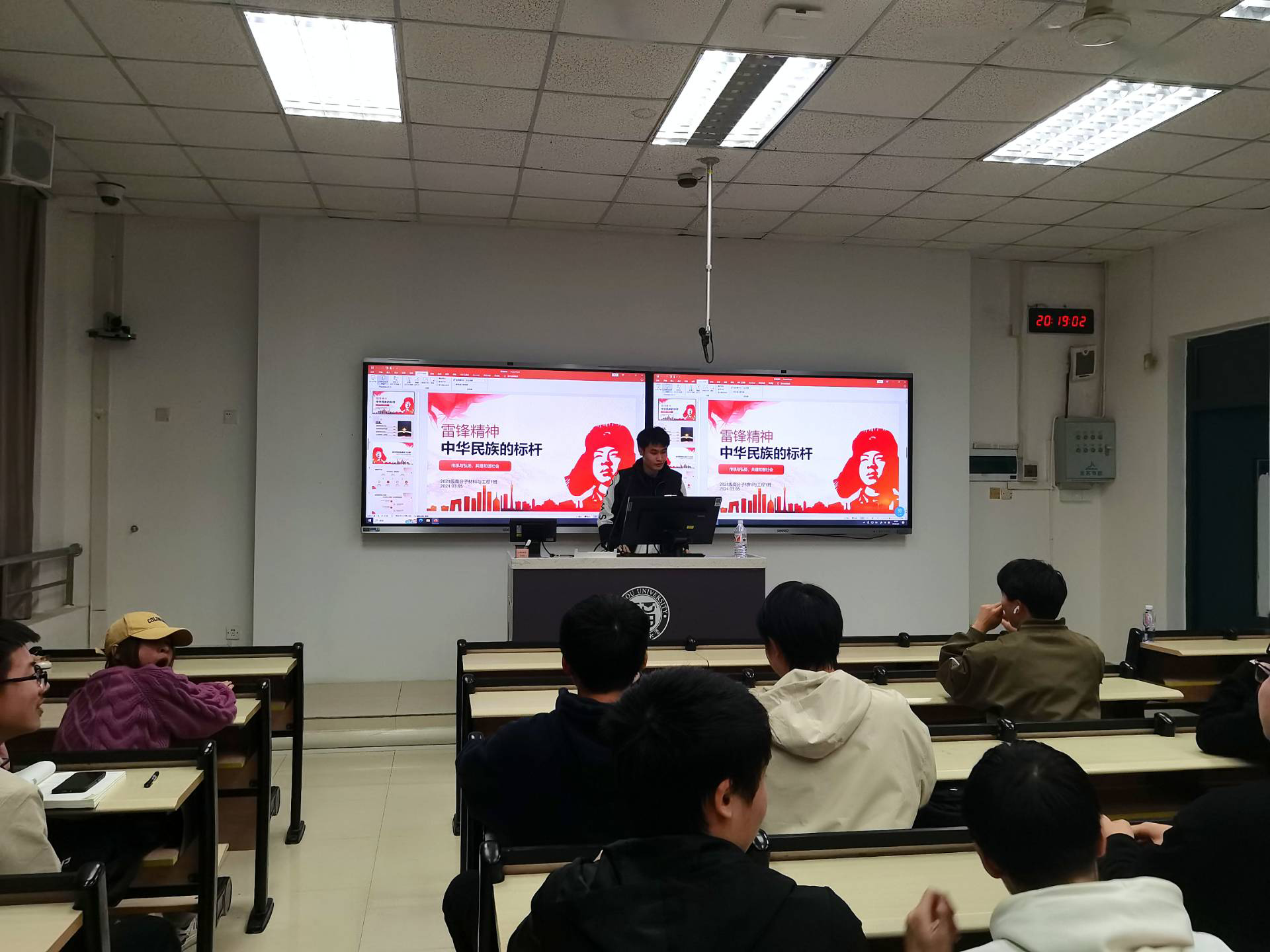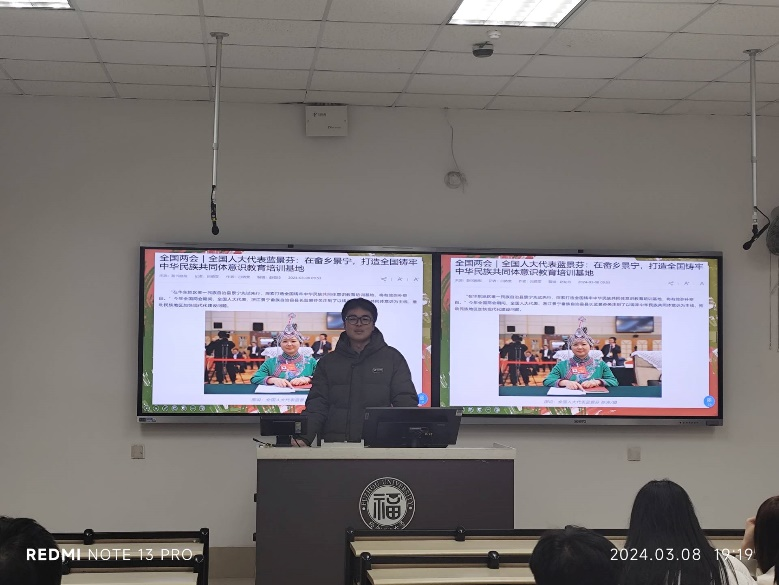 同学们在班会中,以“雷锋精神”为引,深化“青年志愿者”的时代内涵,弘扬雷锋精神,传承红色基因。进一步提倡同学们要团结友爱,从宿舍到班级,从同学到人民群众,从家庭到国家,通过血缘和地缘牢牢凝聚在一起。同时也要不忘初心,牢记使命,多多了解中华优秀传统文化,做好传承与发扬,厚植爱国之情,砥砺强国之志,实践报国之行。