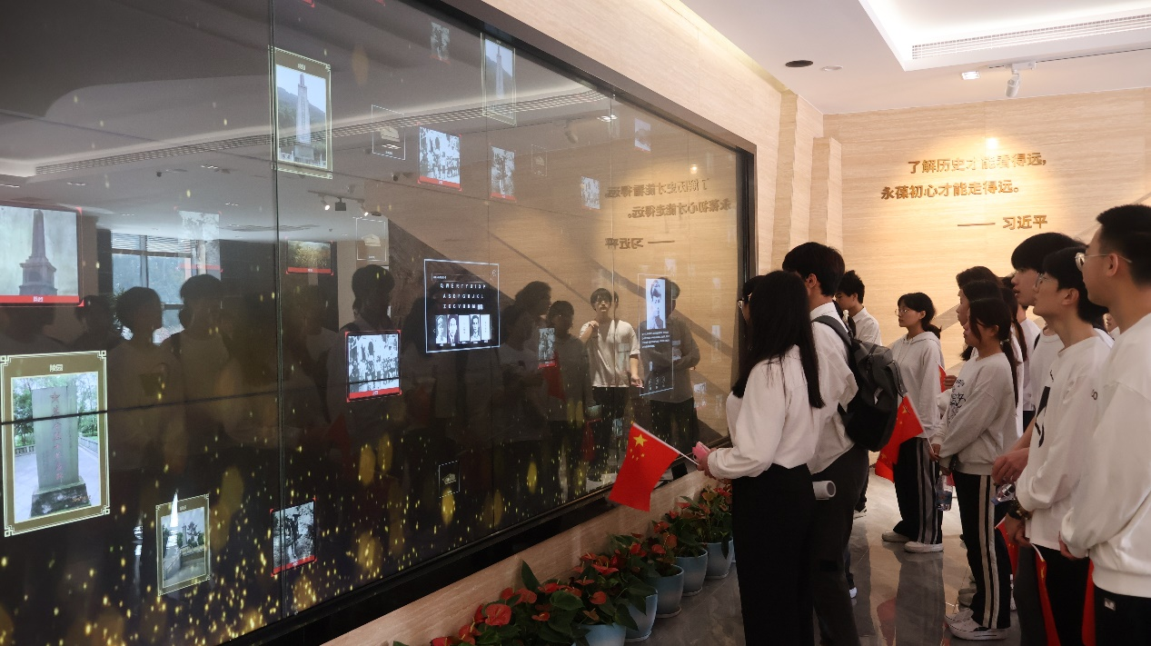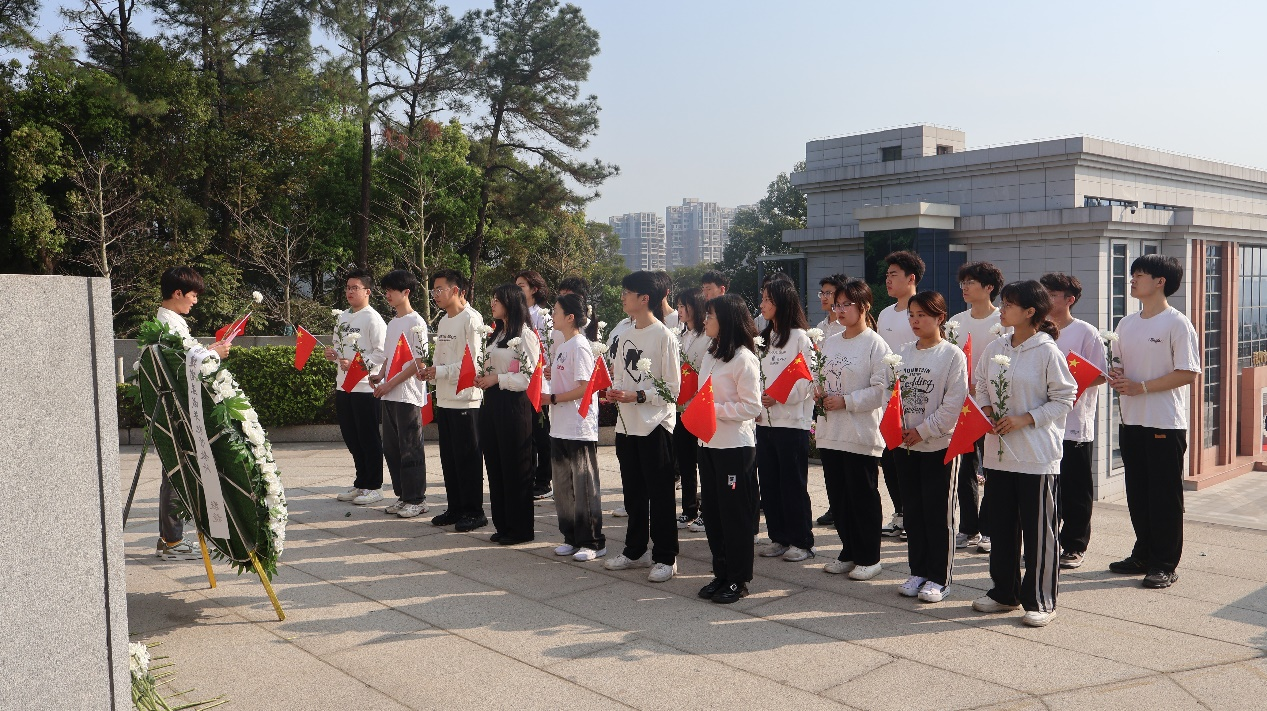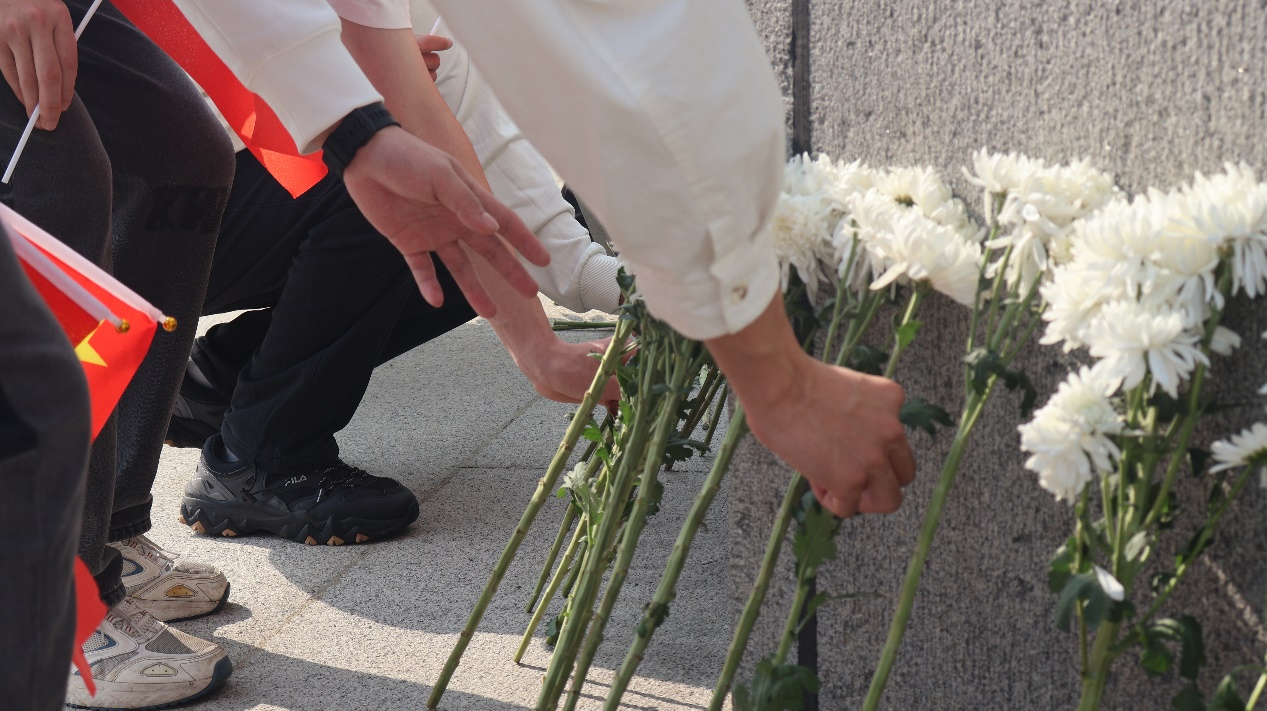 缅怀仪式开始,大家在纪念碑前默哀一分钟,随后师生们依次上前献上鲜花,表达对先烈的哀思与敬仰之情。