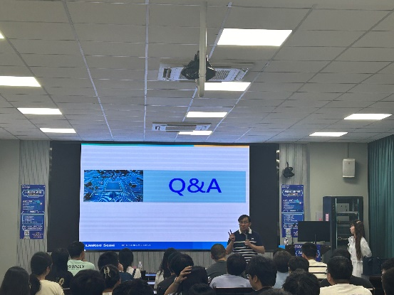 讲座中,荣春老师从“半导体蚀刻工艺简介”“干蚀刻的技术演进”等方面向同学讲解半导体方面的知识,使同学们对这个行业的起源,现状,前景以及挑战更加了解。讲座中,荣春老师还根据现有的就业行情,结合公司实例,向同学们介绍了联芯的薪资待遇,Q&A环节,荣春老师及HR老师就同学们关心的问题进行解答。