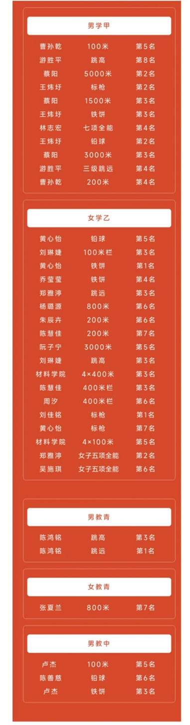 在本次运动会颁奖环节,运动健儿们不负众望,取得了骄人的成绩。材料学院获得了男子学生甲组团体总分第六名、女子学生乙组团体总分第四名、男女学生组团体总分第九名的成果。这些荣耀的背后,是运动员们的不懈努力,也是领导老师、工作人员和后勤人员在背后的关心鼓励与奉献支持。让我们向他们致敬!