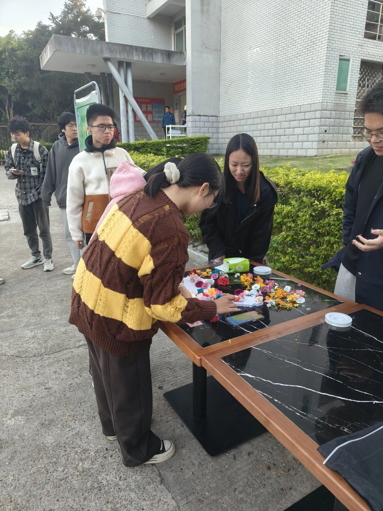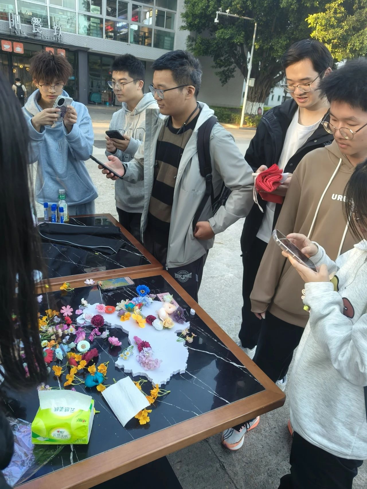 同学们纷至沓来,纷纷挑选出自己心仪的彩色塑料小花,然后用胶水将它们粘贴在地图之上。同学们或将塑料花粘贴在自己家乡所在的位置,或将小花粘贴在自己想去的地方,亦或是贴在台湾这块不可分割的土地上。现场气氛热烈,每位同学脸上都洋溢着喜悦,大家在完成作品后都纷纷掏出手机进行拍照打卡,记录下这不断变得艳丽的中国地图。
