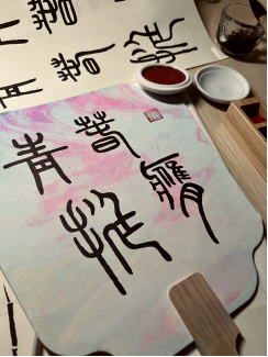 随后,进入漆扇制作环节,同学们根据自己喜欢的颜色进行色彩搭配、将漆液滴入水中、勾画改变大漆的纹路,再持扇轻缓入水,沉入提转之间,扇面便衬出斑斓抽象的图案,同学们以扇为纸,以漆为笔,以水为墨,制作出了独属于自己的漆扇。待扇面晾干后,大家便用毛笔在漆扇上写下对祖国的热爱与祝福。随后,进入漆扇制作环节,同学们根据自己喜欢的颜色进行色彩搭配、将漆液滴入水中、勾画改变大漆的纹路,再持扇轻缓入水,沉入提转之间,扇面便衬出斑斓抽象的图案,同学们以扇为纸,以漆为笔,以水为墨,制作出了独属于自己的漆扇。待扇面晾干后,大家便用毛笔在漆扇上写下对祖国的热爱与祝福。