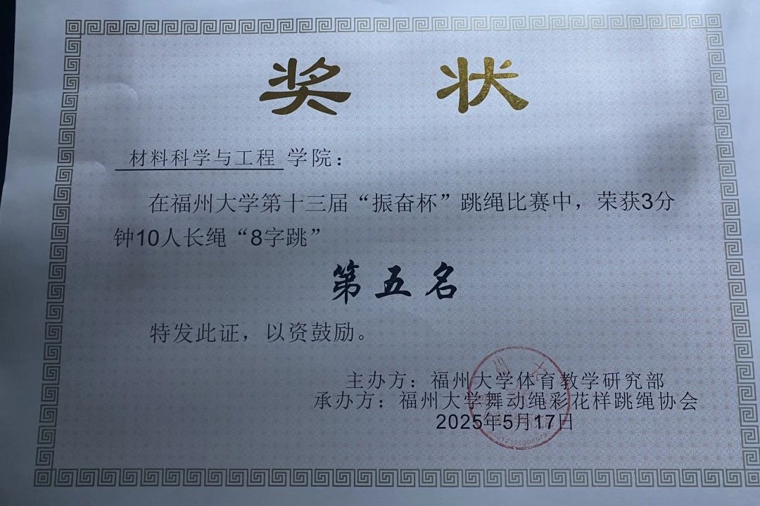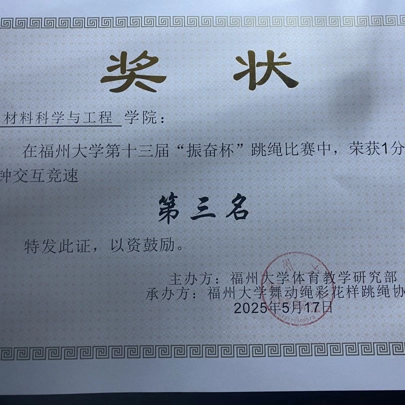 体育精神映照科研之路。此次跳绳比赛不仅展现了材料学子的拼搏风采,更启示我们:学习与科研亦需如训练般沉心静气、持之以恒。希望同学们将赛场上的吃苦精神融入日常,以坚韧不拔的毅力探索材料科学前沿,践行 “材料报国” 使命。同时,也呼吁大家重视体育锻炼,以强健体魄为基石,在学术与生活中持续发力,书写属于材料人的精彩篇章。