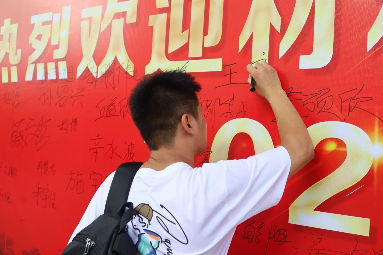 报到后的新生们纷纷驻足,或手持马克笔郑重写下自己的名字,或与同行的家长、新认识的同学并肩签名合影。每一个签名都是新生们对大学生活的郑重承诺,每一张合影都承载着初入校园的喜悦与期待。