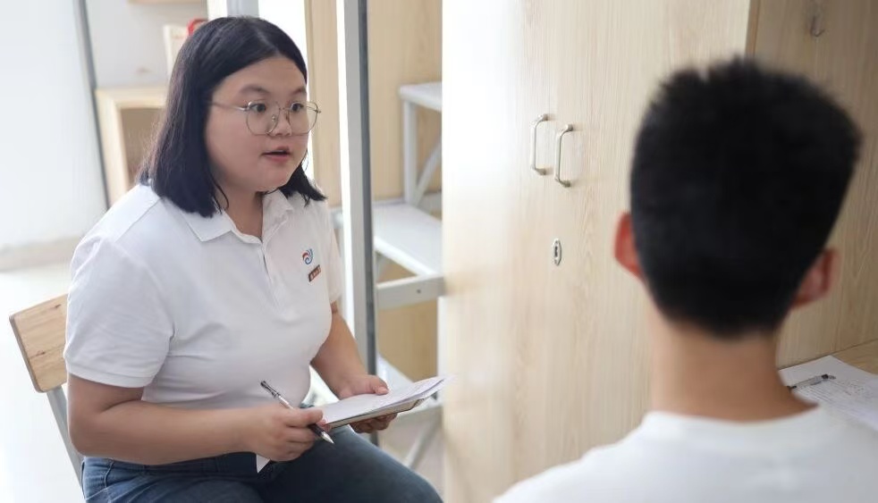 张丽娟老师与新生在“绿色通道”谈话室谈话