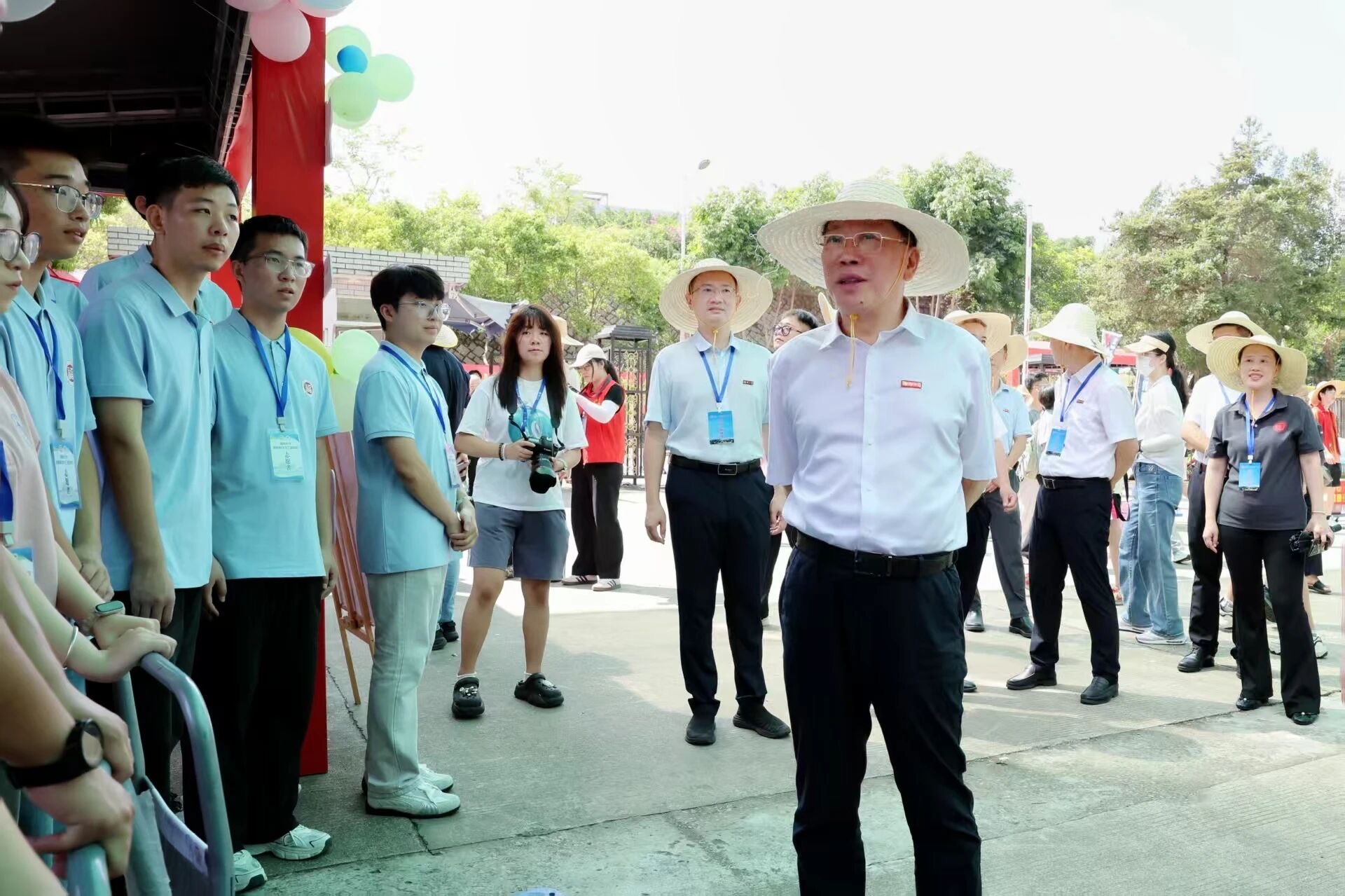 在铜盘校区,校党委陈国龙书记、王向阳副书记、邱挺副校长等校领导莅临材料学院迎新点,实地察看迎新工作开展情况并给予指导与肯定。随后,陈国龙书记向学院新生代表表示亲切问候,并亲手为新生佩戴校徽。