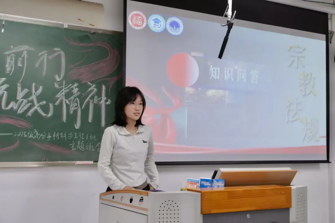 10月26日,2025级高分子材料与工程1班在铜盘校区A栋教学楼212教室顺利举办班会。本次班会以“团结奋斗向复兴,厚植爱国创新风”为主题,由班长陈响主持,特邀辅导员张丽娟老师、班主任朱水洪老师、“材智下乡,材动产业”实践队队员欧阳敏及班导陈梓坤共同出席,2025级高分子材料与工程1班全体同学参加。