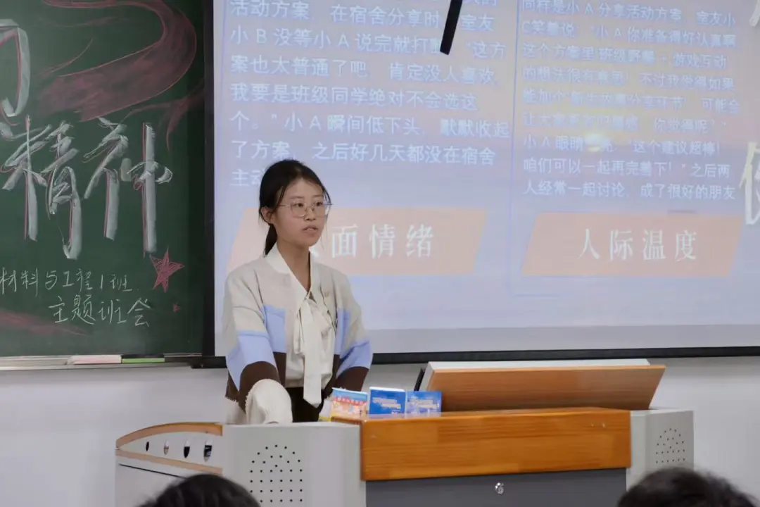随后,心理委员熊丽瑶同学围绕大学生人际交往这一主题,引导大家步入心理健康教育环节。通过匿名问卷收集同学们有关人际交往的困惑,再以“人际交往小剧场”和情景模拟这样生动的形式,解析社交密码,分享“共情解忧”小技巧。让同学们在互动中学会打破内心隔阂,减少自我消耗,也为构建温暖、和谐的大学人际关系奠定了基础。