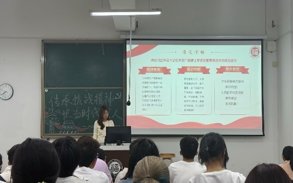 班会伊始,团支书张馨元同学带领同学们回顾了中国人民的抗战历史,为同学们讲解了习近平总书记在纪念中国人民抗日战争暨世界反法西斯战争胜利80周年大会上的重要讲话精神和伟大抗战精神的内涵,帮助同学们更好地学习和弘扬这两种精神,强化了同学们的责任担当。