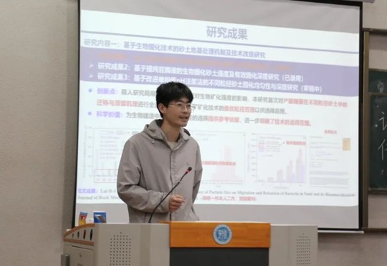 邓水权同学以“严谨求实,开拓创新”为主线,呈现了一场富有启发性的经验分享。他结合自身在岩土工程领域的科研实践,从三个维度给出了宝贵建议:在学术研究层面,他着重强调要培养“问题导向”的科研思维,并以自身在生物岩土技术领域的探索实践为例,清晰展现了从发现砂土粒径影响规律,到创新豆酶提纯方法的完整研究脉络;在实践能力方面,他鼓励同学们注重跨学科融合,通过“单相低pH注浆法”的改进实例,他讲明如何将理论知识转化为解决工程问题的创新方案;在个人发展方面,他以班级党支部书记的身份分享时间管理经验,在专注学业的同时积极参与志愿服务和文体活动,实现全面发展。这些经验为同学们规划大学生活提供了具体可行的参考路径。
