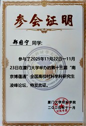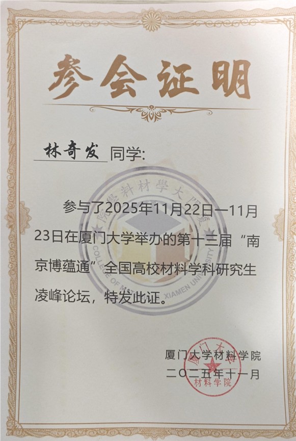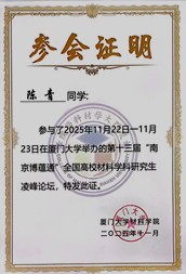 2025年11月21-23日,由厦门大学研究生院、厦门大学材料学院及南京博蕴通仪器科技有限公司联合举办的第十三届“南京博蕴通”全国高校材料学科研究生凌峰论坛在厦门大学举行。本届论坛以“弘扬嘉庚创新精神,勇攀南强科学凌峰”为主题,旨在为研究生提供一个交流分享的平台,深化其对材料科学的理解,并推动其探索新的研究方向。成人网站 材料学院2023级博士研究生陈青、2023级硕士研究生林奇发、2024级硕士研究生郑图宁受邀参加本次论坛,与各高校的研究生代表们以学术汇报形式展开学术交流。