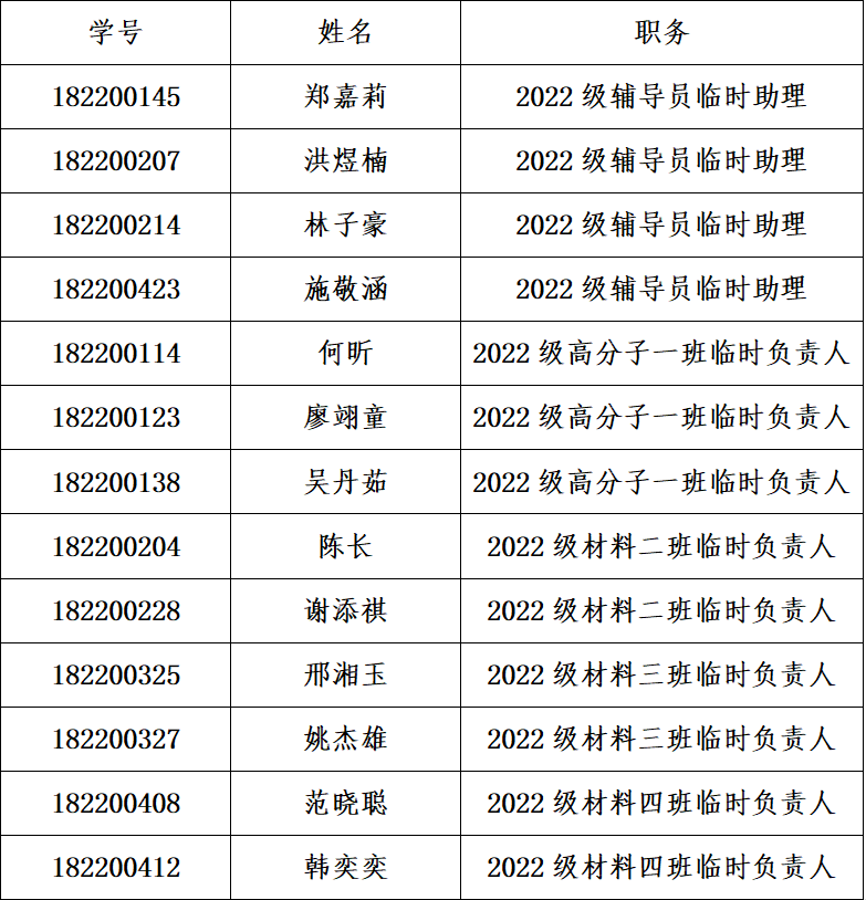 经学生本人申请、辅导员及各班导班助面试审核,同意推选郑嘉莉等4名同学为成人网站 2022级新生辅导员临时助理,推选何昕等9名同学为2022级新生班级临时负责人。现将具体名单公示如下: