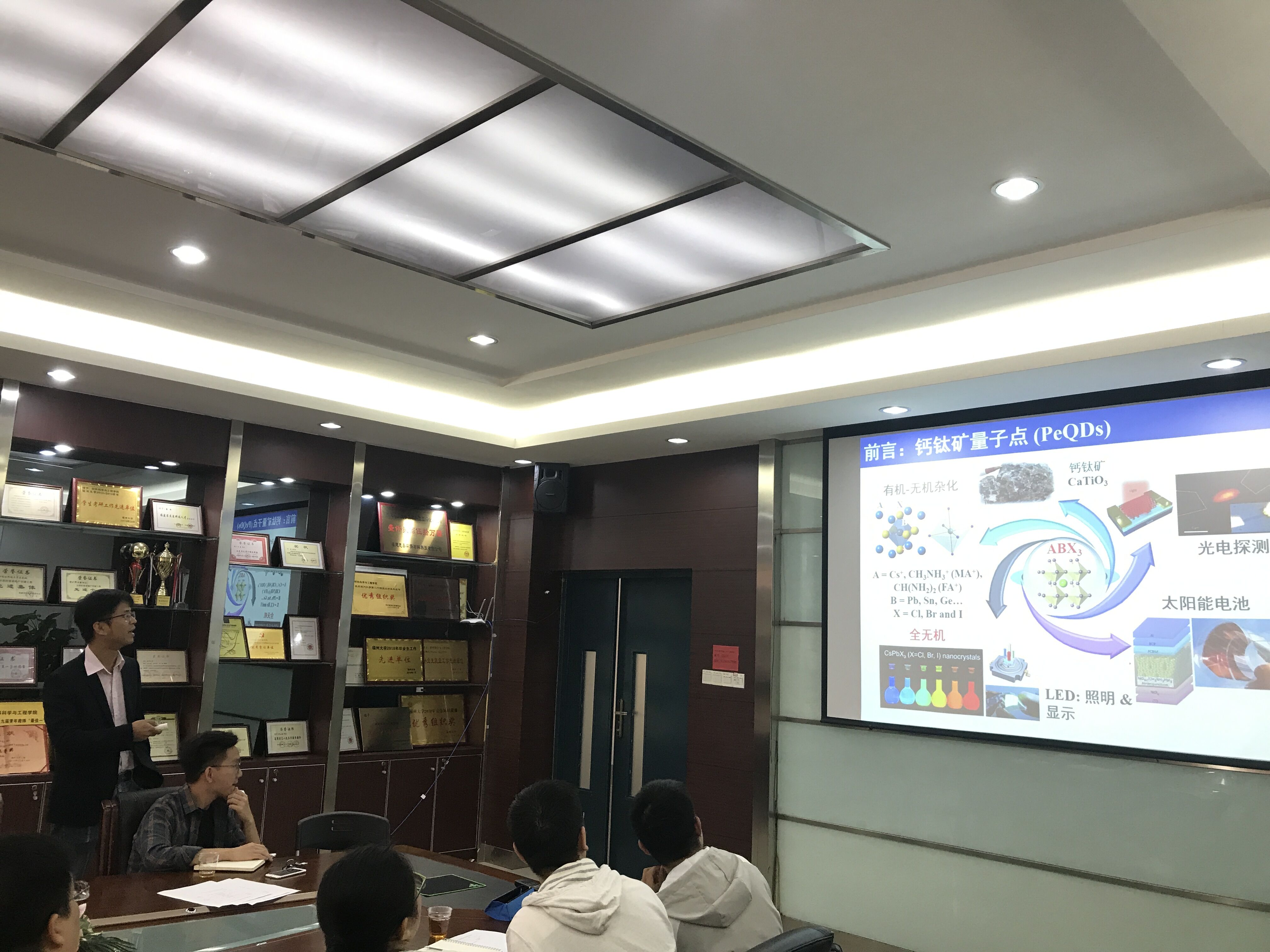 报告中,郑伟副研究员提出一种辐射能量传递上转换新机制,利用稀土纳米晶到CsPbX3量子点的辐射能量传递,首次实现了CsPbX3量子点在低功率半导体激光器激发下的全光谱高效上转换发光,并通过剪裁稀土离子的荧光寿命将CsPbX3激子的表观荧光寿命从ns量级提升到ms量级;并结合稀土和钙钛矿量子点的发光优点,提供了一种上转换和长余辉发光调控的新策略,也为稀土/钙钛矿量子点新型复合发光材料在光电领域的应用开辟了新的方向。报告尾声,郑伟副研究员与成人网站 师生就相关问题进行深入交流和探讨。