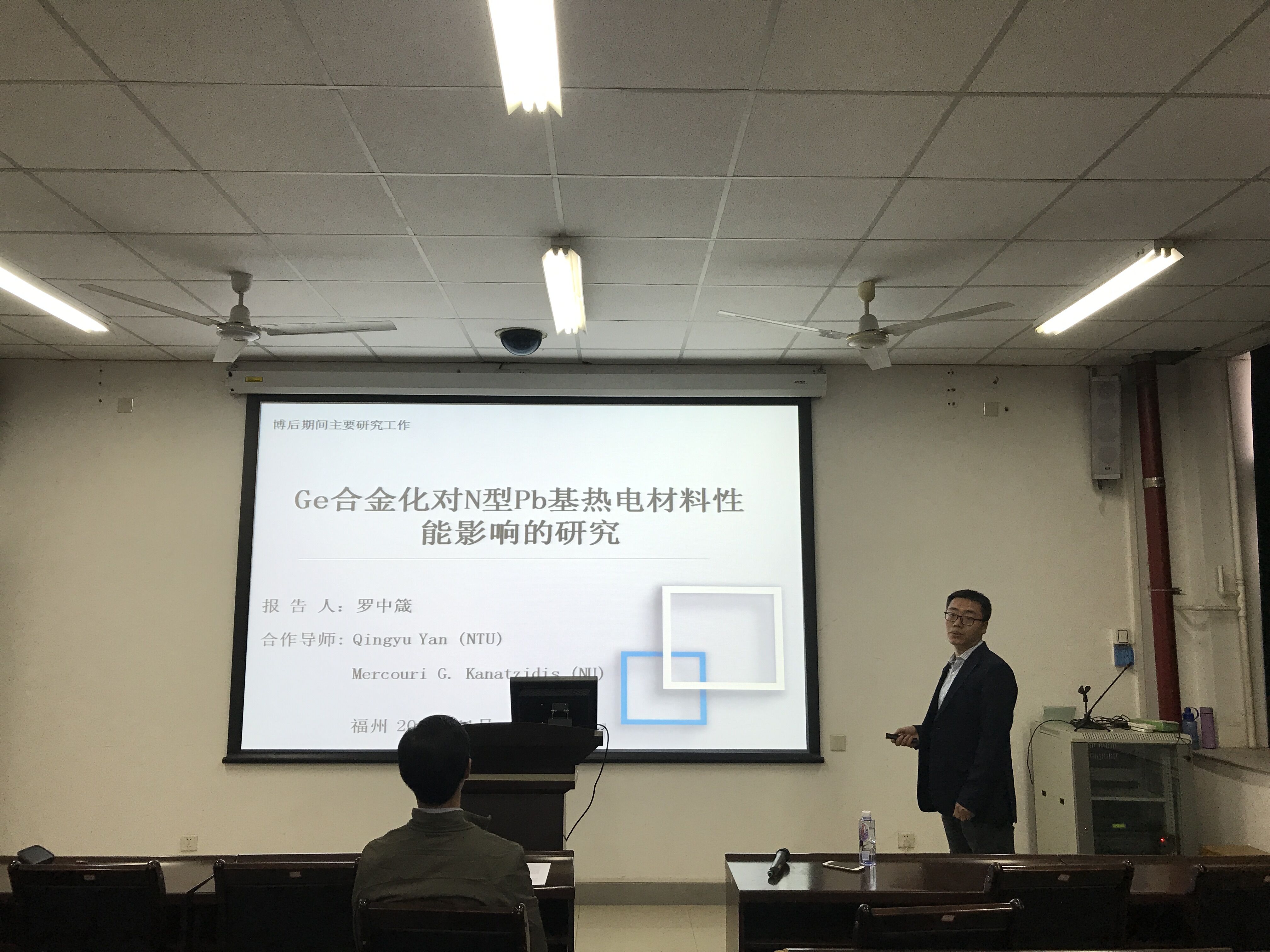 2019年11月22日,罗中箴博士莅临材料科学楼404做学术报告,报告题目为“Ge合金化对N型Pb基热电材料性能影响的研究”。材料学院李凌云副院长主持报告。