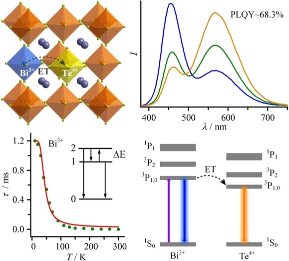 1)由于强电子-声子耦合和从Bi3+到Te4+的高效能量转移,微晶表现出宽的双波段白光发射,源自Bi3+与Te4+的构型间 3P0,1 → 1S0 跃迁,具有良好的稳定性和高光致发光 (PL) 量子产率高达 68.3%。
