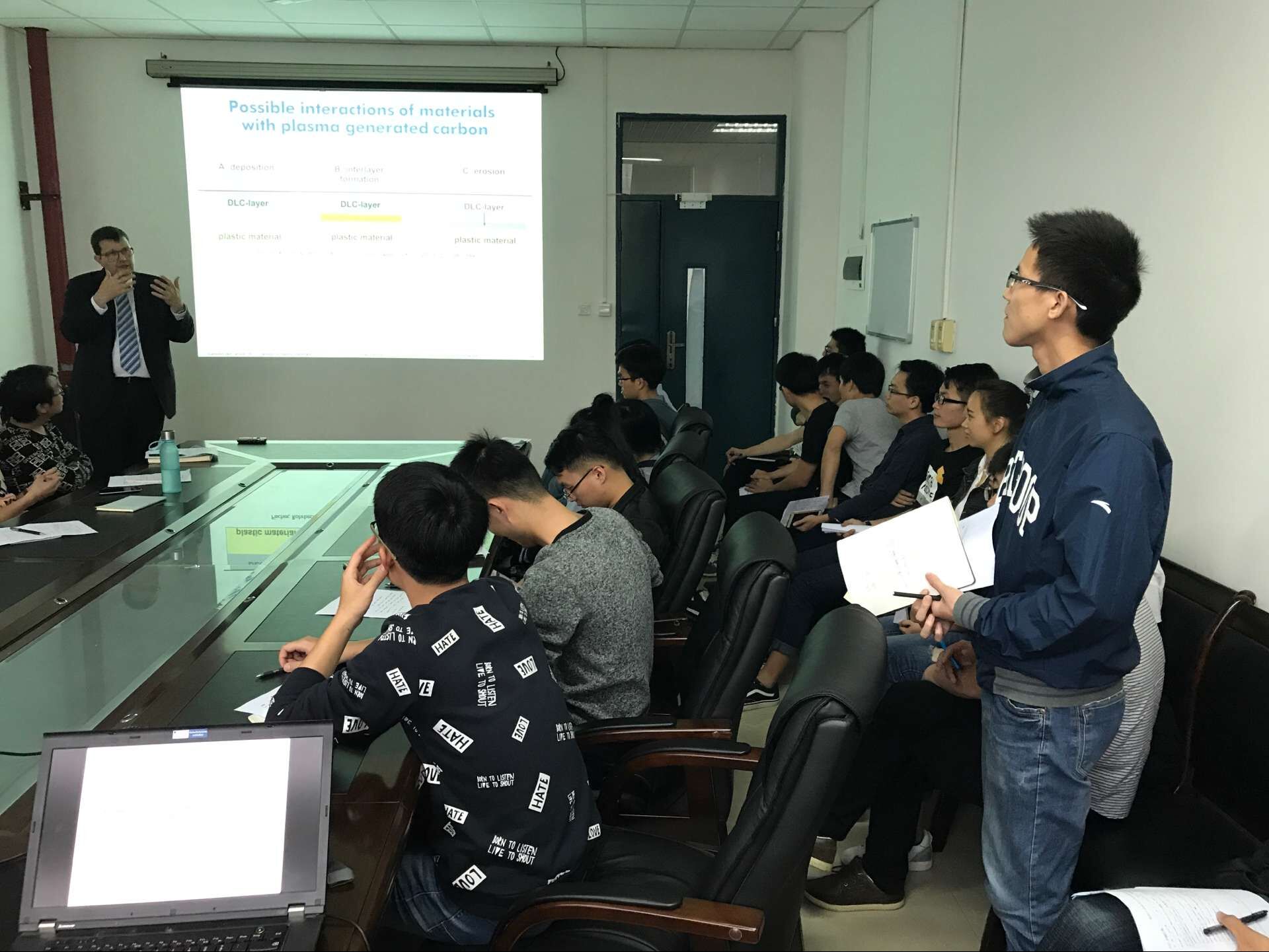 首先,Stefan Wehner教授在嘉锡楼313会议室与成人网站 教师进行座谈,会议由成人网站 张腾副院长主持,陈栋阳、萨百晟等多位年轻教师出席。张腾副院长对Wehner教授的来访表示热烈欢迎,并为客人介绍了成人网站 概况,在场成人网站 教师代表逐一做了自我介绍。随后Wehner教授简要介绍了德国科布伦茨-兰道大学的基本情况,详细介绍了其与材料科学与工程专业相关的学科情况,并表达了与成人网站 建立合作的强烈期望。Feege女士进一步介绍了成人网站 与科布伦茨-兰道大学之间已经建立的1+2硕士双授学位合作情况,并回答了在场教师代表的提问。座谈会后,Wehner教授移步材料科学楼406会议室为成人网站 的研究生开展了一场关于“Diamond like carbon (DLC) coatings on plastic materials”的学术讲座。Wehner的课题组将DLC通过等离子体增强气相沉积发(PECVD)成功地覆盖在高分子制件的表面,形成一种致密的保护层,与平常的高分子材料相比具有低磨损、化学稳定性好、抗菌和生物相容性好等优点,具有广阔的应用前景。