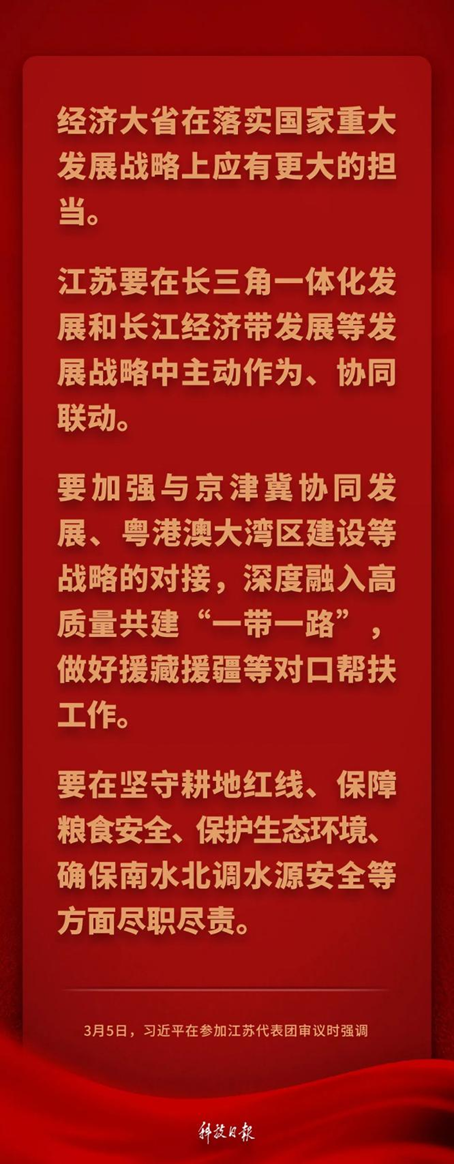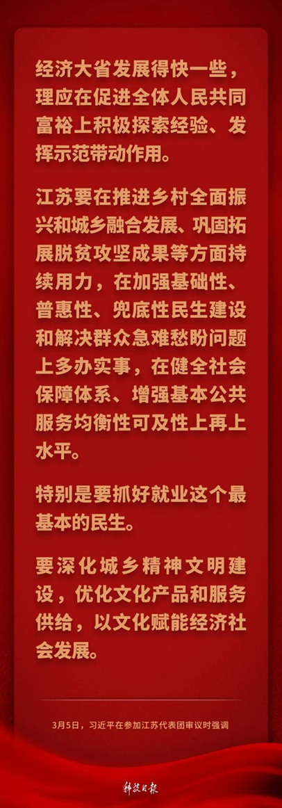 中共中央总书记、国家主席、中央军委主席习近平5日下午在参加他所在的十四届全国人大三次会议江苏代表团审议时强调——