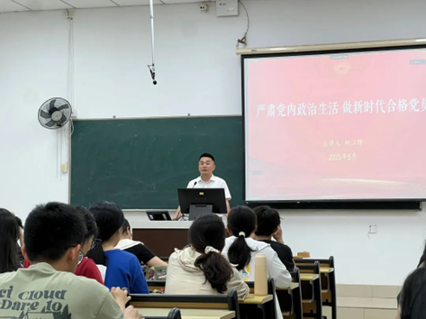 化学学院党委副书记柯江锋副教授以《严肃党内政治生活 做新时代合格党员》为题开展讲座。他介绍党内规矩体系,强调党章的重要性,深入解读不同时期的党内政治生活。讲座最后,柯教授结合习近平总书记对青年党员的殷切期望,寄语学员能够在学习生活中践行党内政治生活要求,发挥先锋模范作用。