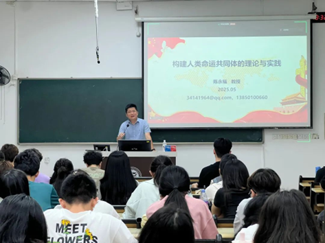 校学生工作部(处)副部(处)长陈永福教授以《构建人类命运共同体的理论与实践》为主题开展讲座。陈教授围绕着人类命运共同体提出、人类命运共同体的哲学蕴含、人类命运共同体的新时代意义、推动人类命运共同体建设实践和人类命运共同体建设的启示这五个方面进行阐述,为青年大学生党员带来巨大启示。